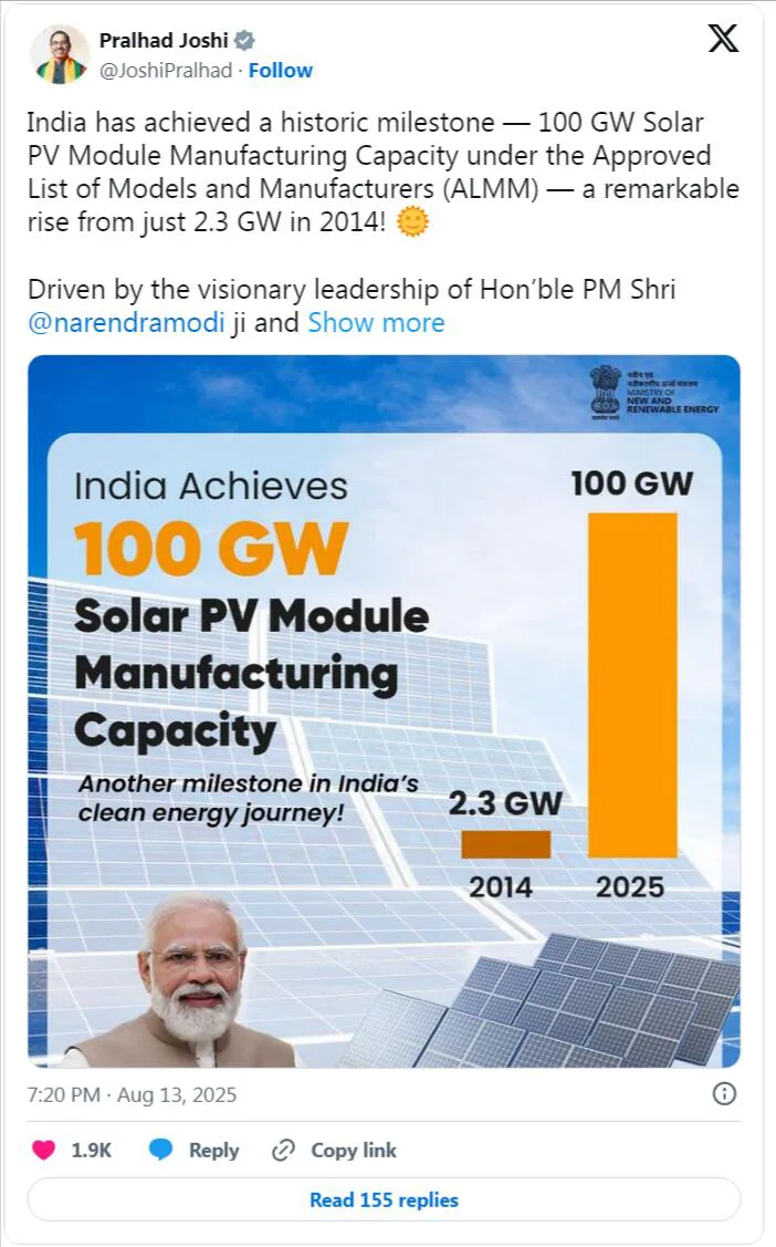 အိန္ဒိယနိုင်ငံမှပြန်လည်ပြည့်ဖြင့်တင်နိုင်သည့်စွမ်းအင်မဟာမိတ်အသစ် 0 န်ကြီး Prahad Joshi ကဤအောင်မြင်မှုကိုဖော်ပြခဲ့သည်။ ထိရောက်သောနေရောင်ခြည်စွမ်းအင်ထုတ်လုပ်မှုနှင့်ဆက်စပ်သောမက်လုံးပေးရေးဆွဲခြင်းအစီအစဉ် (PLI) တွင်အိန္ဒိယသည်ခိုင်မာသောနှင့်မိမိကိုယ်ကိုလုံလောက်သောနေရောင်ခြည်စွမ်းအင်သုံးထုတ်လုပ်မှုဂေဟစနစ်ကိုတည်ဆောက်ရန်နှင့် 2030 တွင်အိန္ဒိယနိုင်ငံ၏ Gigawatts ၏ဂိုးသွင်းယူနိုင်မှုကိုတိုးမြှင့်ပေးလိမ့်မည်။